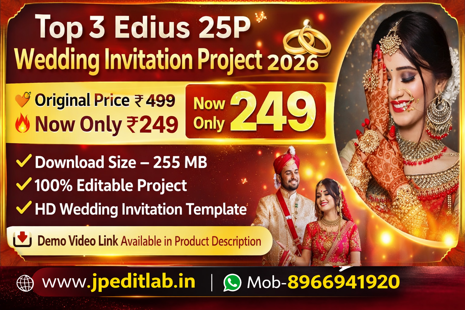 Top 3 Edius 25P Wedding Invitation Project 2026 एक professional HD wedding invitation video template pack है, जिसे आप आसानी से Edius Pro में edit कर सकते हैं। यह project 100% editable है जिसमें आप name, date, photo और text आसानी से change कर सकते हैं। Project का download size 255 MB है और यह high quality 25fps timeline में बना हुआ है।